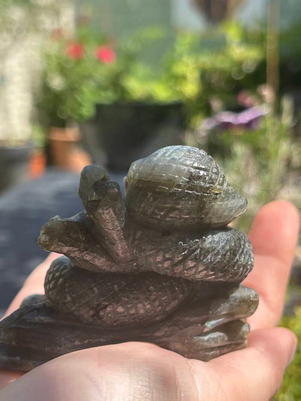 Prachtige Cobra gesneden uit Labradoriet. Heeft een goede flash.
